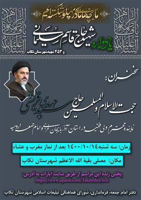 یادواره دومین سالگرد شهادت سردار حاج قاسم سلیمانی و ایام فاطمیه با سخنرانی نماینده ولی فقیه در استان آذربایجان غربی امشب، سه شنبه در مصلی تکاب برگزارخواهدشد.